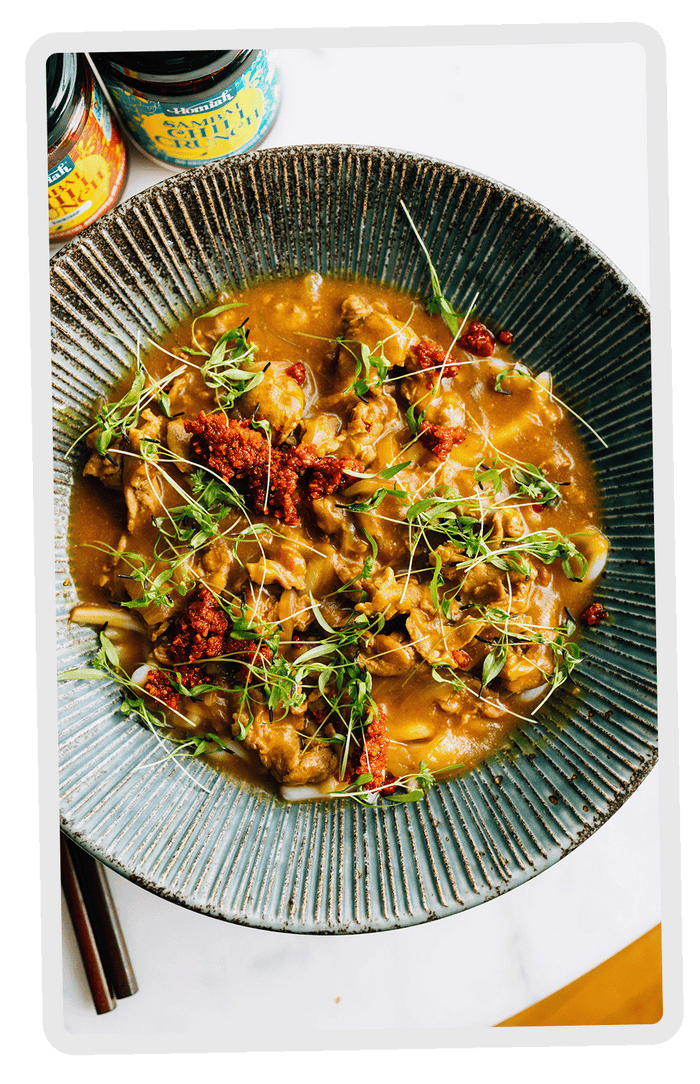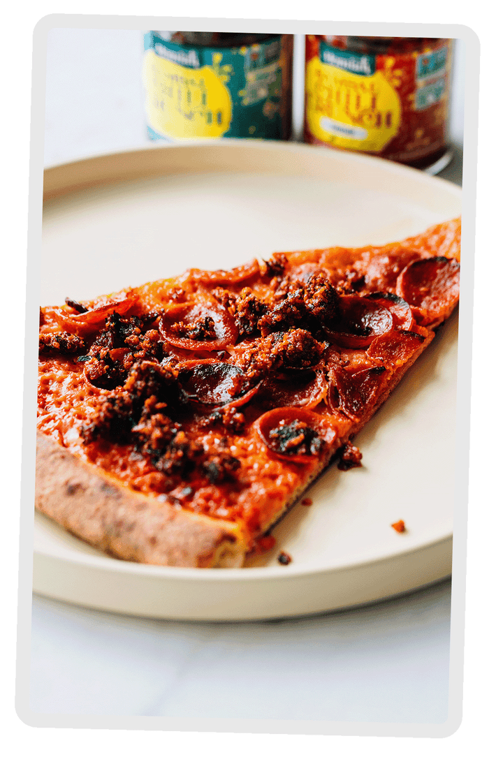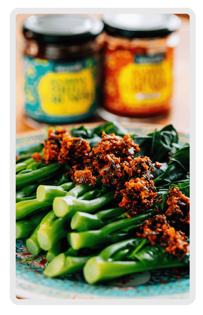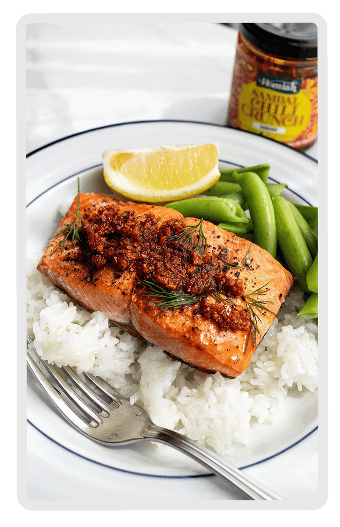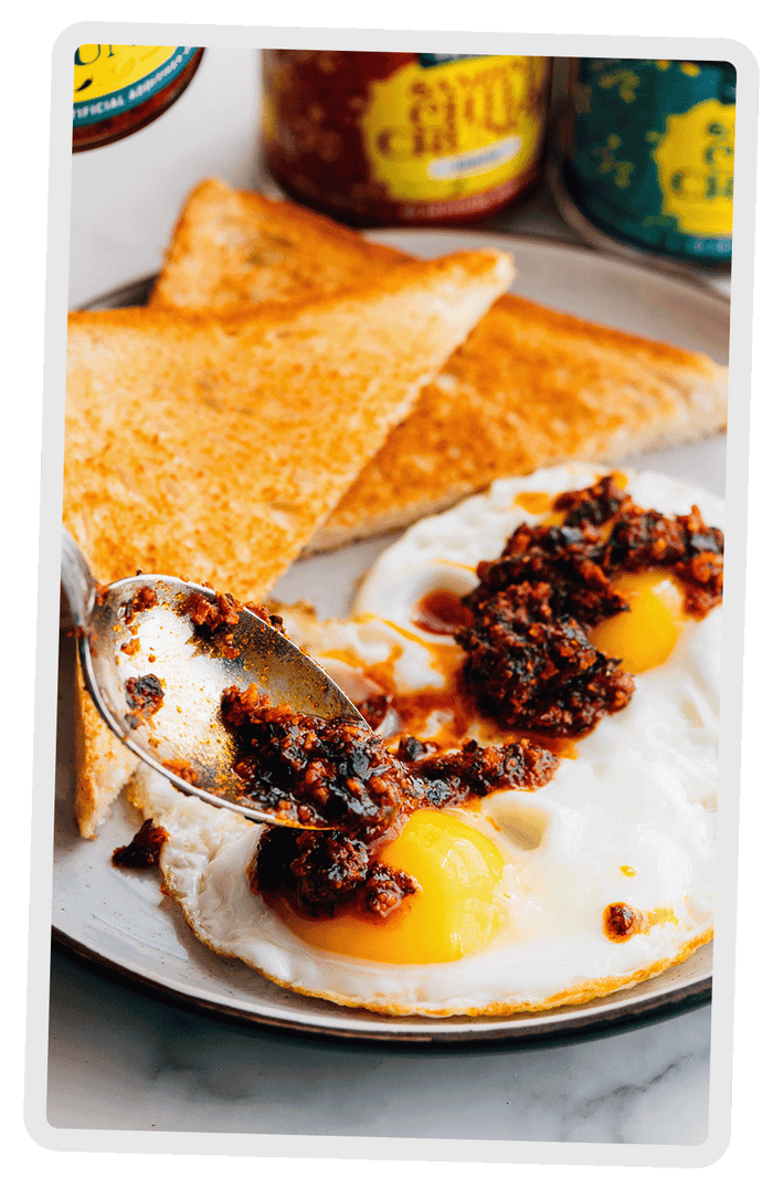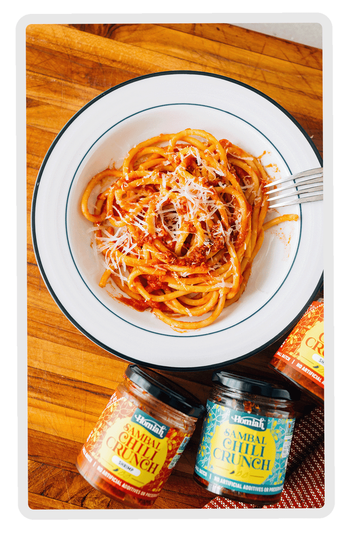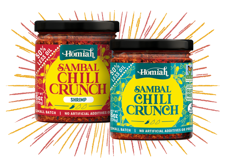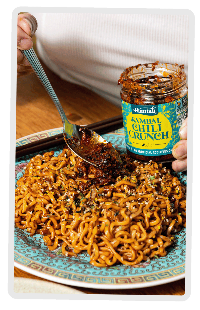 Experience the addictive blend of spicy, savory, and sweet flavors of our Sambal Chili Crunch. Crafted with less oil and less sodium, this is a guilt-free topping that elevates every dish. Our Gluten Free, GMO-free, and Soy-free Chili Crisp is made from our Malaysian Nonya family recipe using hand sourced ingredients from local farms. Available as Original or Vegan. Only mildly spicy.