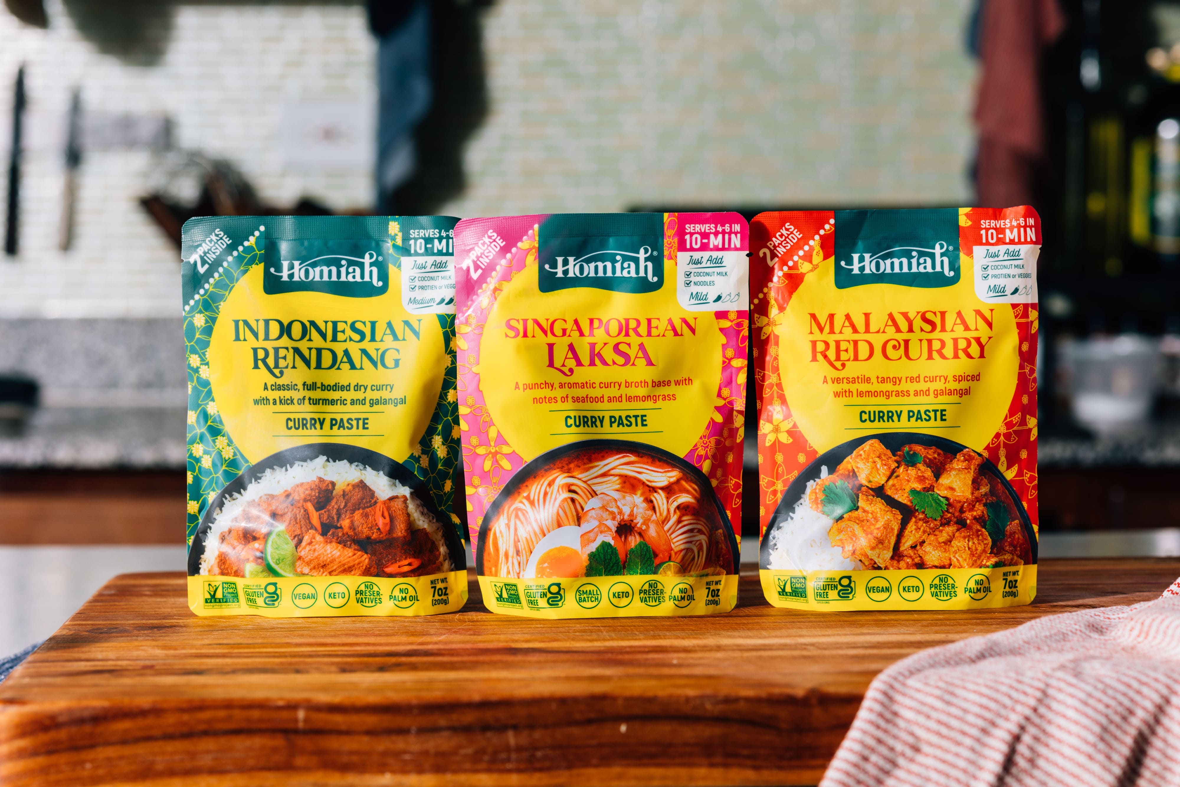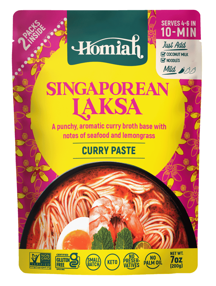 Indulge in the rich, authentic taste of Homiah's Southeast Asian Sampler. Discover new dishes and elevate your cooking game with Singaporean Laksa, Indonesian Rendang and Malaysian Red Curry. Easy to use and only mildly spicy, these are made from Nonya recipes inherited by founder Michelle from her Granny Nonie. Just simmer with your protein of choice and serve in 15 minutes!